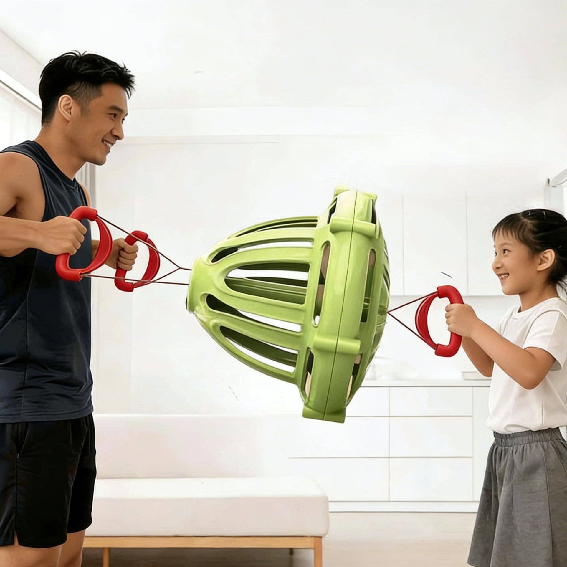 一人が引っ張るとボールが開き、もう一人がリラックスさせて閉じる。